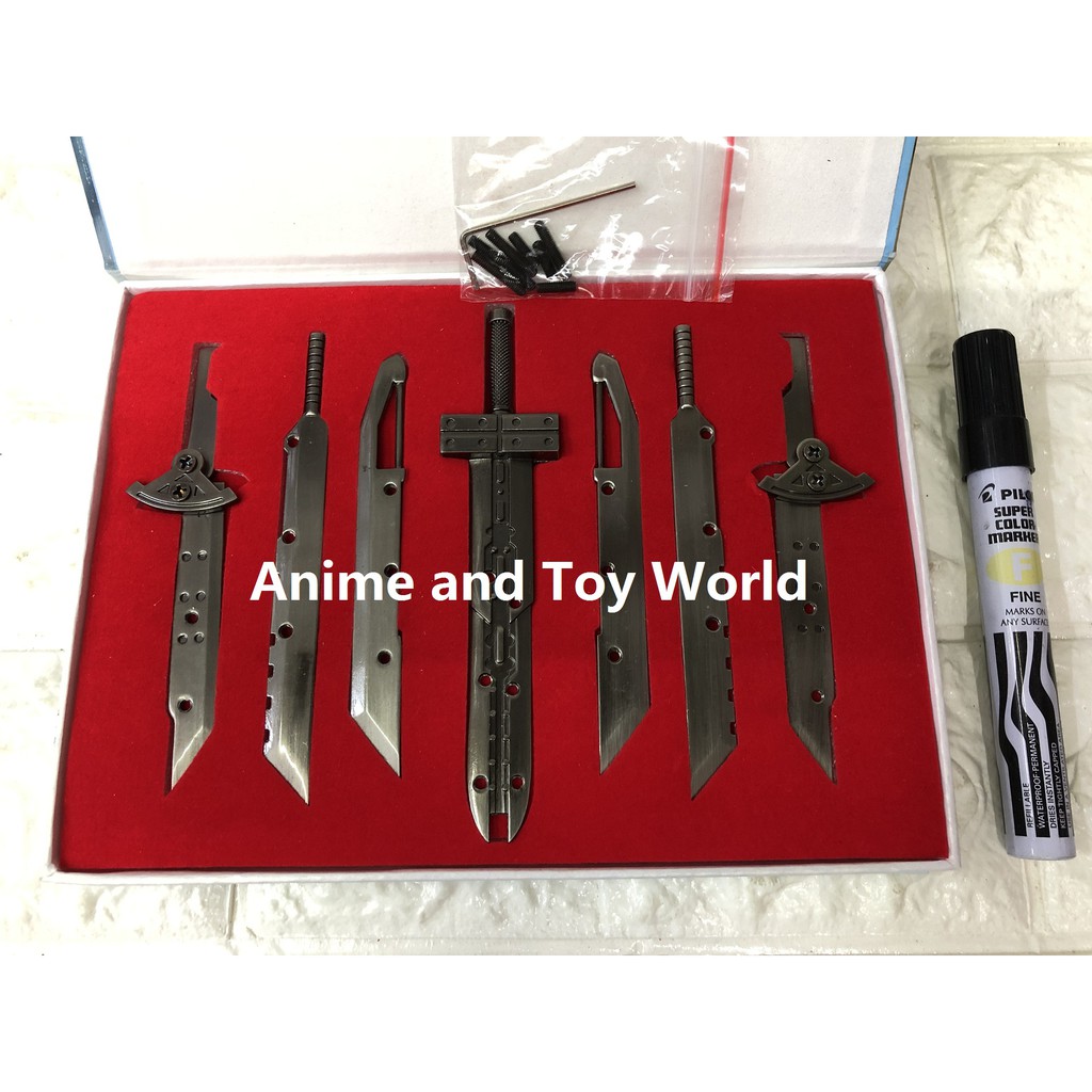 The Buster Swords appearance. Its blade width is 5. Six smaller swords that can combine into a large blade resembling his original Buster Sword. Cloud uses the base sword and the others in its set as his preferred weapon in Final Fantasy VII. Short snip from Advent Children when cloud places the buster sword back after his encounter with Kadaj and his gang. We all know he wielded the Ultima Weapon while fighting Sephiroth in the last battle in the original Final Fantasy VII but there was a 2 year time gap between that and AC. Buster Sword has a 32 blade length and 115 handle length.